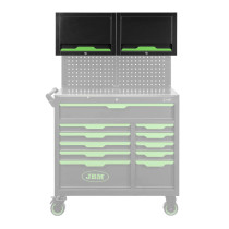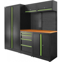 13 moodulist koosnev töölaud koos sahtelmooduli, riiulkapi, lauakapi, perfoseina ja ülakappidega. Paks 38 mm MDF plaat on kaetud roostevaba teraslehega. Kvaliteetne, pulbervärvitud 0,8 mm paksune eriteras. Kõik sahtlid laagritega siinidel. Uksed-sahtlid lukustatavad. Reguleeritavad jalad. Kappide/moodulite asukohta on võimalik omavahel vahetada. Kogukõrgus 1950 mm, laius 2410 mm. Perfoseina avade mõõt laialt levinud 10x10/28 mm. Sahtli sisemõõt 567x408 mm. Võimalik juurde tellida riputuskonkse, erinevaid hoidetarvikuid, LED-töölaua valgustit (17919J), lisamooduleid, erinevat värvi käepidemeid, jne.