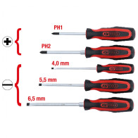 Komplektis rist- ja lapikkruvikeerajad. Aastatepikkuse arendustöö tulemusel on loodud üks parimaid 2K komposiitmaterjalist käepidemeid turul. Käepide annab kasutajale lisa keeramisjõu ning samas tagab käe ohutuse. Kruvikeerajad on valmistatud MoSiV eriterasesegust, mis on tugev ja vastupidav. Ideaalne profikasutamiseks. Kruvikeeraja tööots on laser-termotöödeldud. Pappkarbis. Valmistatud Slovakkias, Triumf tehases.